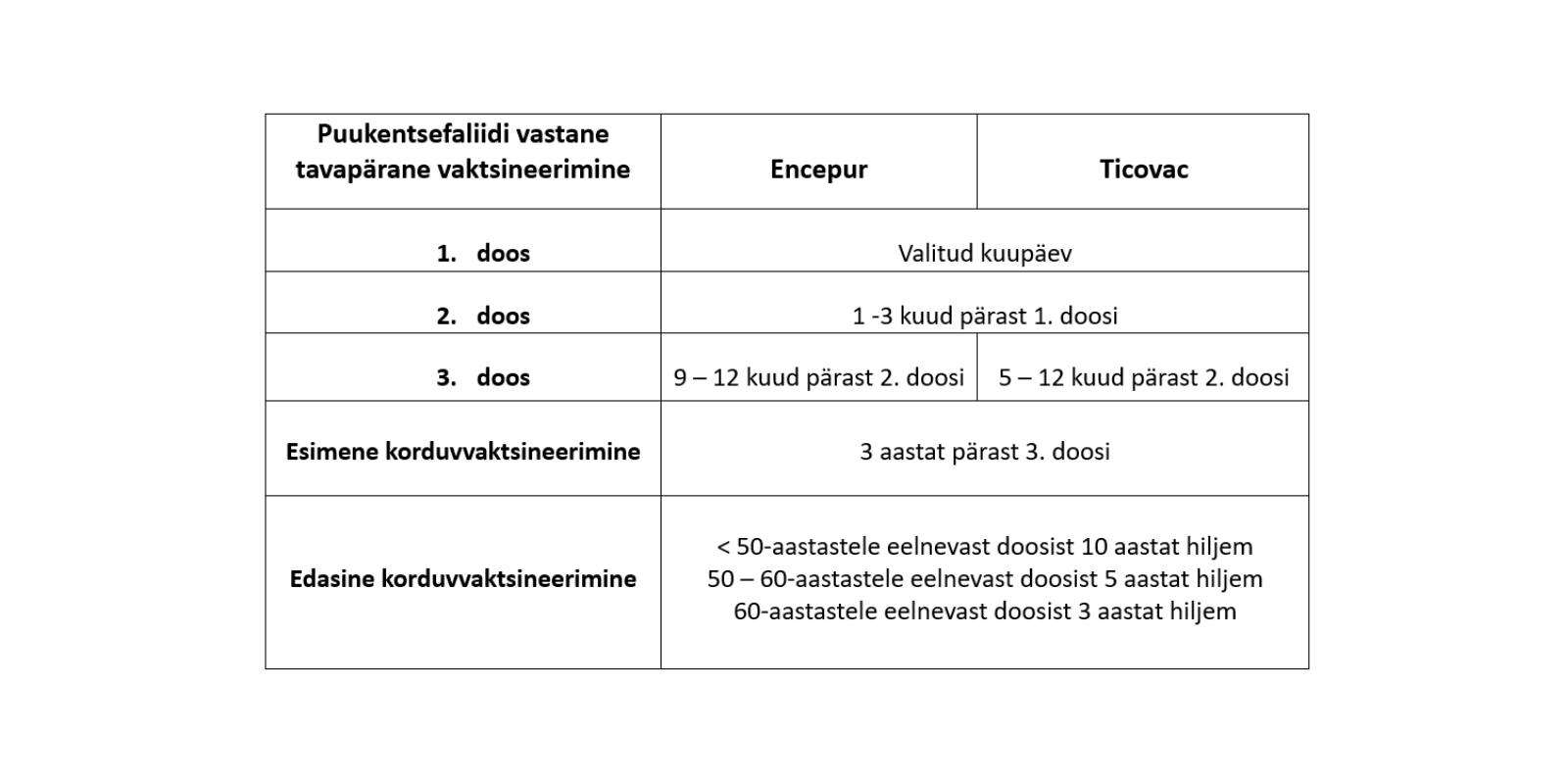 Esmakordne vaktsineerimine koosneb kolmest süstist, millest kaks esimest tehakse 1-3-kuulise vahega ja kolmas vaktsiinisüst kuni aasta hiljem. Seejärel toimuvad korduvvaktsineerimised vastavalt 3-10 aasta järel. Kui soovid teha korduvvaktsineerimise, tuleta meelde, millal sind viimati puukentsefaliidi vastu vaktsineeriti. Eelmise vaktsineerimise aega saab vaadata ka terviseportaalist www.terviseportaal.ee